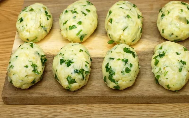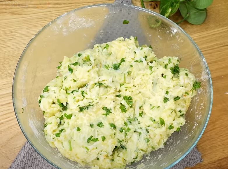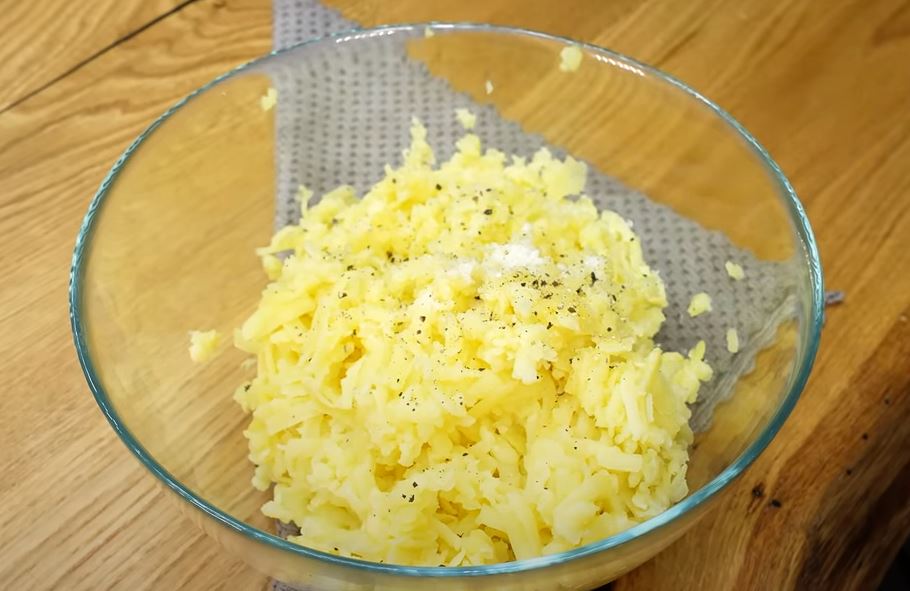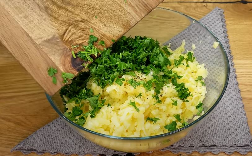 Grate boiled potatoes. Add parsley, a teaspoon of salt and black pepper to it.