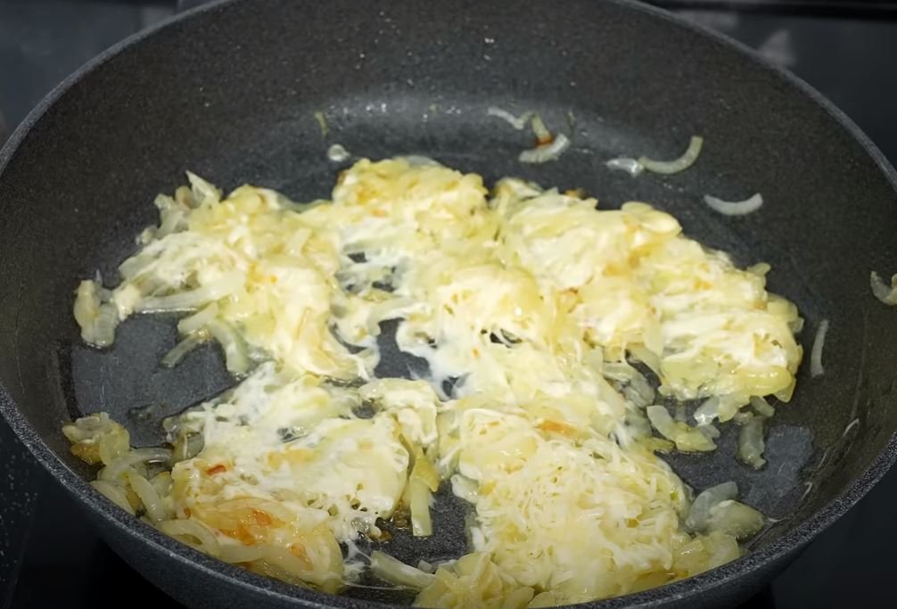In a pan with fried onions, add butter, grated cheese and over low heat melt butter and cheese.