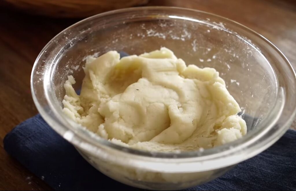 Wrap the potatoes around the onion mold. We make the shape of a potato donut.