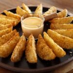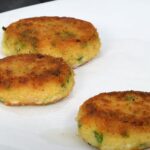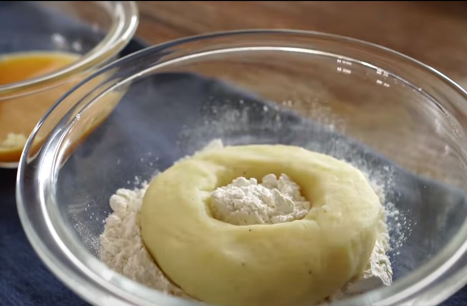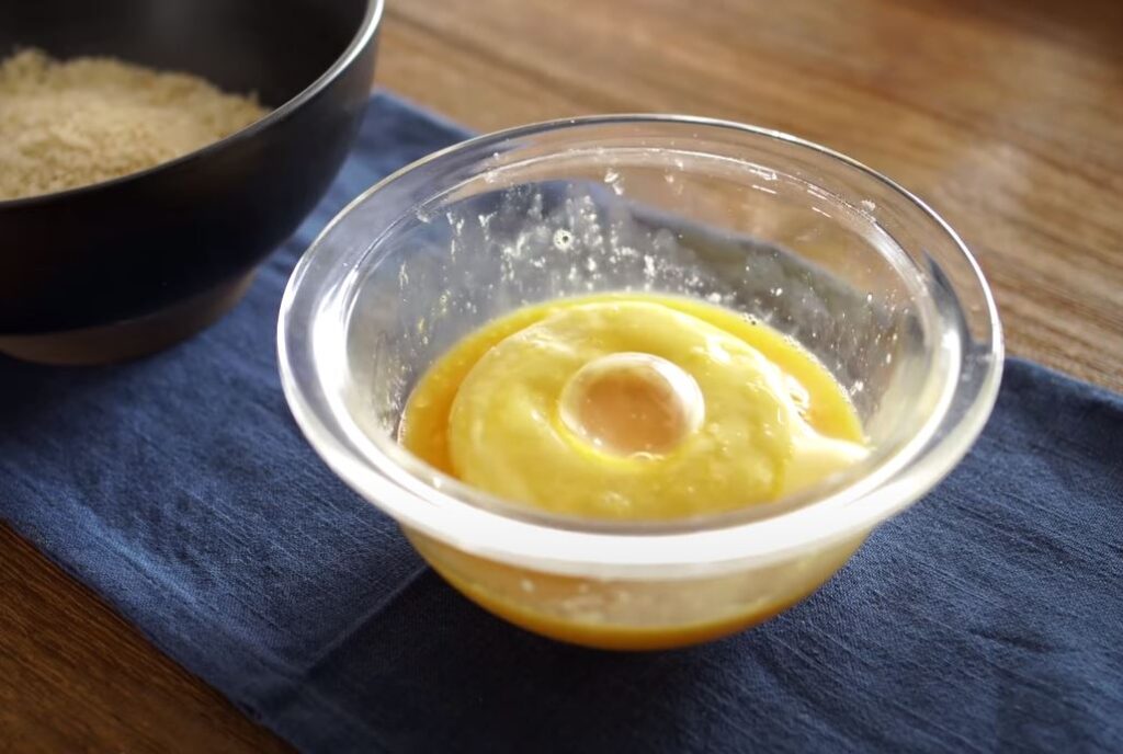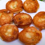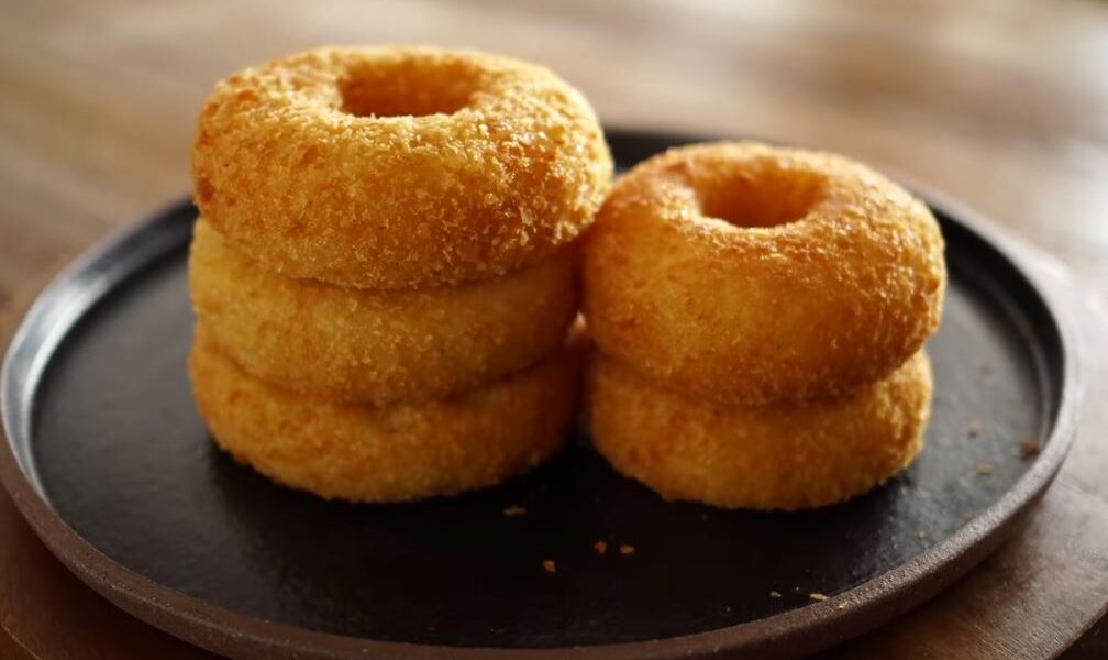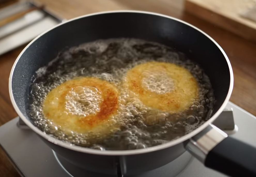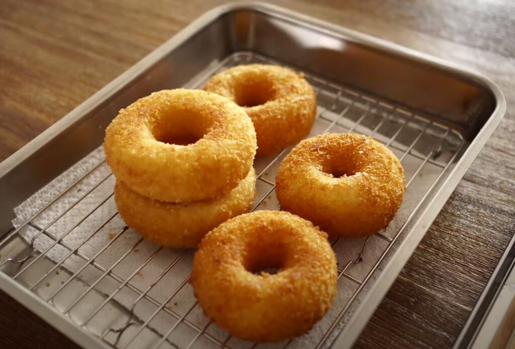 Dip the potato donut one by one, first roll well in flour, then in the egg and then in breadcrumbs.