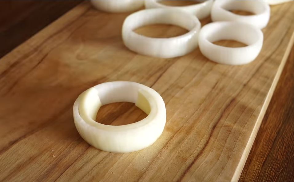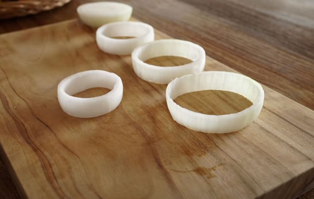 Use the onion as a mold for potato donuts. We need a large onion, cut it into three parts.